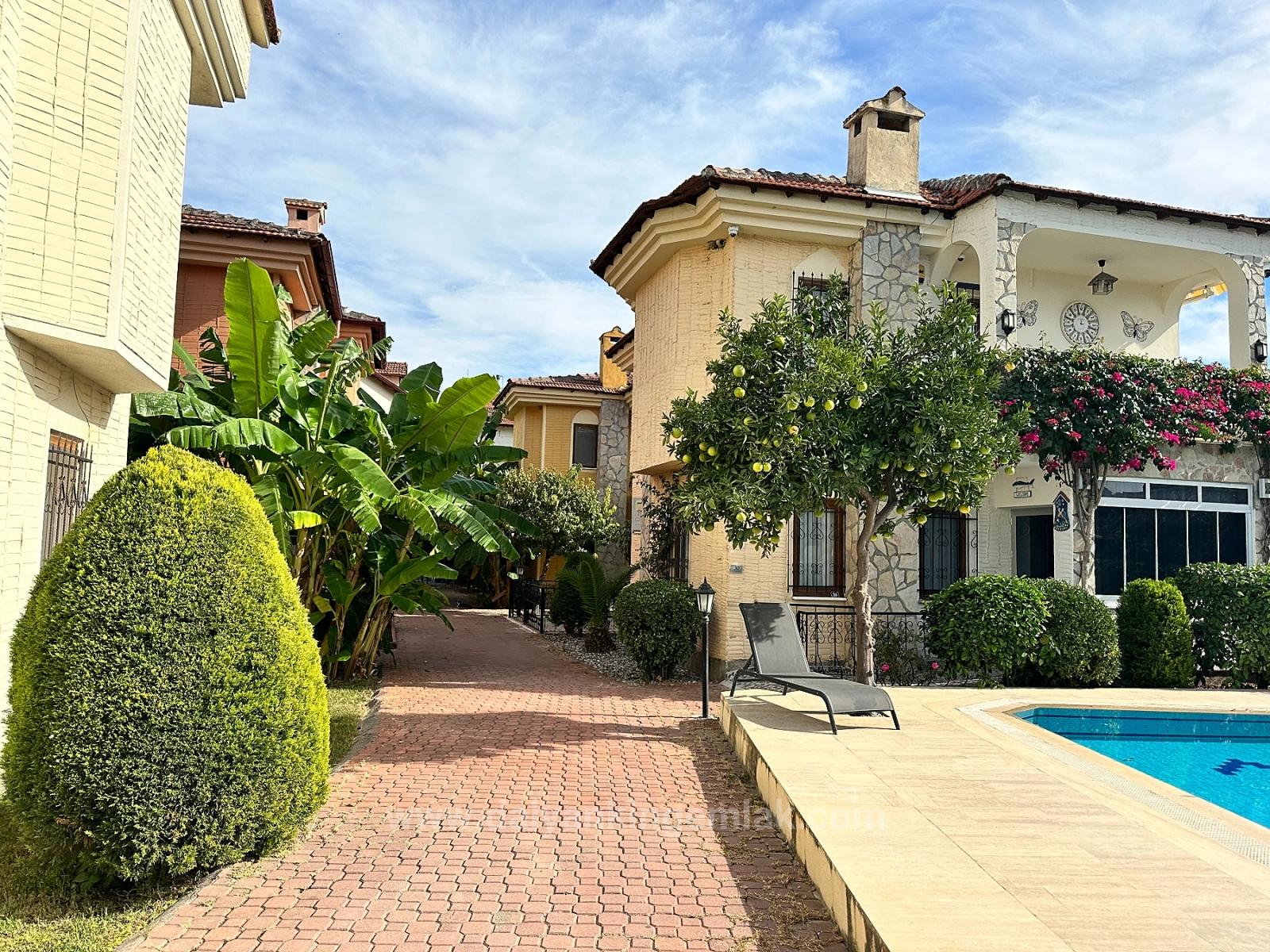 data-end="875">In dieser gepflegten Anlage mit insgesamt sieben Villen steht eine Villa zum Verkauf. Die Anlage ist als Wohnanlage organisiert. Vor dem Gebäude befindet sich ein 40 m² großer Gemeinschaftspool. Der Poolbereich ist von Gärten mit tropischen Pflanzen umgeben, die jeder Villa eine großzügige, grüne und einladende Atmosphäre verleihen. Die kompakte und dennoch durchdachte Grundstücksstruktur bietet ein ausgewogenes Verhältnis zwischen Gemeinschaftsgefühl und Privatsphäre. Beim Betreten der Villa empfängt Sie eine helle und einladende Eingangshalle. Von hier aus gelangen Sie fließend in den offenen Wohnbereich mit angrenzender, kürzlich renovierter Küche. Die sonnige Terrasse lädt zum Verweilen, Essen im Freien, Entspannen oder gemütlichen Gesprächen ein und verbindet so den Außenbereich mit dem Wohnen. Der Wohnbereich ist in zwei separate Bereiche unterteilt: einen Ess- und Arbeitsbereich auf der einen Seite und ein geräumiges, komfortables Wohnzimmer auf der anderen. Ein Gäste-WC befindet sich ebenfalls im Erdgeschoss. Über die Treppe erreichen Sie die privaten Wohnbereiche im Obergeschoss. Das geräumige Hauptschlafzimmer an der Vorderseite des Hauses verfügt über einen schönen Balkon mit Blick auf das Grundstück und ist lichtdurchflutet. Zusätzlich gibt es zwei weitere große Doppelzimmer mit jeweils eigenem Balkon, die eine großzügige und ruhige Atmosphäre bieten. Das Familienbadezimmer besticht durch ein stilvolles und funktionales Design, das Funktionalität mit moderner Ästhetik verbindet und mit Steindetails renoviert wurde. Die Melody Villa wird komplett möbliert zum Verkauf angeboten und ist bezugsfertig. Die neuen Eigentümer benötigen lediglich die Schlüssel. Dank ihrer zentralen Lage, der ruhigen Grundstücksgestaltung und der harmonischen Raumaufteilung ist diese Villa eine äußerst attraktive Option für alle, die ein dauerhaftes Zuhause, ein komfortables Ferienhaus oder eine solide Investition in Dalyan suchen. Diese exklusive Immobilie ist exklusiv über King Real Estate erhältlich. p data-start=2517 data-end=2547 data-is-last-node= data-is-only-node="">Immobilien-Autorisierungsnummer: 4800246