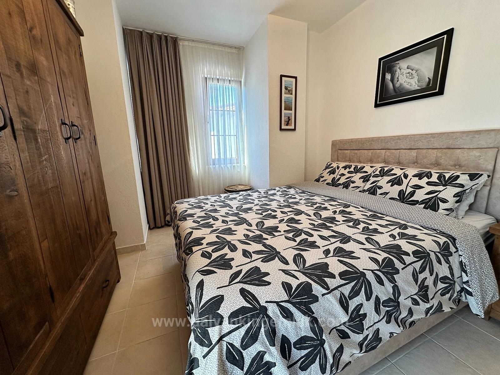 Schon beim Betreten der Villa wird deutlich, dass hier Komfort und Bequemlichkeit im Vordergrund standen. Das Erdgeschoss empfängt Sie mit einem modernen, offenen Grundriss. Die neu renovierte, moderne Küche bildet das stilvolle Herzstück des Hauses. Ausgestattet mit durchdachten Details wie einem cleveren, ausziehbaren Gewürzregal und einem geräumigen Vorratsschrank, spricht sie all jene an, die Wert auf Funktionalität und Design legen. Der angrenzende Wohnbereich geht fließend in die elegant erweiterte, verglaste Terrasse über. Einst ein reiner Sitzbereich im Freien, ist dieser nun ein vielseitiger, geräumiger und heller Raum, der sich für jede Jahreszeit eignet und als zusätzliche Lounge, Leseecke oder idealer Wohnraum für gesellige Abende mit Gästen bei Sonnenuntergang dient. Im Obergeschoss setzt sich das durchdachte Design fort. Hier befinden sich zwei geräumige Doppelschlafzimmer, jeweils mit eigenem Bad. Das Hauptschlafzimmer öffnet sich zu einem privaten Balkon – perfekt für den Morgenkaffee mit Blick auf die ruhige Straße. Im obersten Stockwerk befindet sich das gemütliche und ruhige dritte Schlafzimmer, eingebettet unter dem schrägen Dach. Seine intimen Proportionen verleihen dem Raum Charakter und Charme. Dieses Zimmer ist ein idealer Rückzugsort für Gäste, ein Kinderzimmer oder ein Ort für kreative Tätigkeiten wie Schreiben und Hobbys. Der Außenbereich verkörpert einen Lebensstil, der auf Einfachheit und Entspannung basiert. Der pflegeleichte Garten umgibt das Haus und schafft das Gefühl einer mühelosen grünen Oase. Die Liegewiese verspricht herrliche Momente an heißen Sommertagen, während der glitzernde Gemeinschaftspool die perfekte Abkühlung bietet. Da sich nur zwei benachbarte Villen auf dem Grundstück befinden, herrscht am Pool stets eine ruhige, private und intime Atmosphäre. Der Außenbereich verkörpert einen Lebensstil, der auf Einfachheit und Entspannung basiert. Sobald Sie vor die Tür treten, entfaltet sich der ganze Charme von Dalyan. Ein gemütlicher Spaziergang am Flussufer, begleitet von sanft dahingleitenden Booten, Restaurants mit lokalen Spezialitäten und der zeitlosen Schönheit der Stadt, lädt Sie zu einem Lebensrhythmus ein, der gleichermaßen friedvoll und inspirierend ist. Diese Villa vereint moderne Elemente mit der Schlichtheit des traditionellen Dalyaner Lebensstils und bietet eine einzigartige Gelegenheit: einen privaten Wohnraum, der ein tiefes Gefühl von Behaglichkeit ausstrahlt und gleichzeitig beste Anbindung an alles bietet, was Dalyan zu bieten hat.
