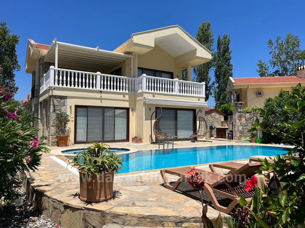 Thus, the view is brought to the heart of the house in its most impressive form. The open-plan living room invites the full splendor of the mountains uninterruptedly inside thanks to the large sliding glass doors that span the entire rear facade of the villa. The extremely spacious and extended balcony, reached by stepping out from these glass doors, is one of the most impressive areas of the house. This villa speaks to its view; and the balcony is designed for you to fully enjoy this view. With comfortable armchairs seating ten people and a large dining table, this is the indispensable place for both sunny days and long evening conversations. An electronic, foldable retractable roof system has been considered for the balcony, which is a real sun trap; thus, comfort is guaranteed in every season. The spacious kitchen, located right next to the living room, has recently been completely renovated and offers an extremely stylish and timeless design with its elegant white cabinets, black porcelain countertops and matching back panels. With its soft lines and classic appearance, it is both aesthetic and functional. The kitchen, with ample cabinet space, is fully equipped with all white goods. The separate dining area inside, with its wooden table seating six, creates an ideal setting for family meals and entertaining guests. The living room also includes a convenient bathroom for guests. Designed with a traditional planning approach, the bedrooms are located on the ground floor to maintain coolness during the summer months. All four bedrooms have spacious en-suite bathrooms designed in a modern wet-floor concept, fully tiled. The elegant marble coverings in cool tones used in each bathroom create an aesthetic unity that extends throughout the villa. The same marble has been re-laid on all floors of the house, giving the spaces a sophisticated and luxurious feel. The villa's exterior is just as impressive as its interior. The spacious garden is covered with well-maintained, lush green lawns; the traditional wooden gazebo at the far end of the garden is a hidden sanctuary for relaxing and enjoying the view. Closer to the house is a 45 m² swimming pool with a separate jacuzzi and a large sun terrace surrounding it. The outdoor dining area, covered with an electrically retractable roof, features a stone barbecue, a sink with under-cabinet, and an outdoor shower, making outdoor living a pleasure year-round. The villa's side features double storage areas and a separate outdoor toilet, while the front has a secure, gated parking area. All outdoor areas are equipped with colourful exterior lighting that highlights the trees, shrubs and walkways, creating a captivating atmosphere in the evening. Villa Cappuccino offers comfortable living year-round thanks to its central heating system and air conditioning units in every room. Recently installed and protected by a CCTV security system, the property has managed to maintain its unique character and warm spirit while preserving a luxurious and contemporary feel thanks to modernization and expansion work. Offered fully furnished, this exclusive villa is an ideal choice as both a year-round family home and a privileged holiday residence with its modern amenities, elegant details and impeccable living spaces. Villa Cappuccino is one of those rare places where view, comfort and elegance come together.