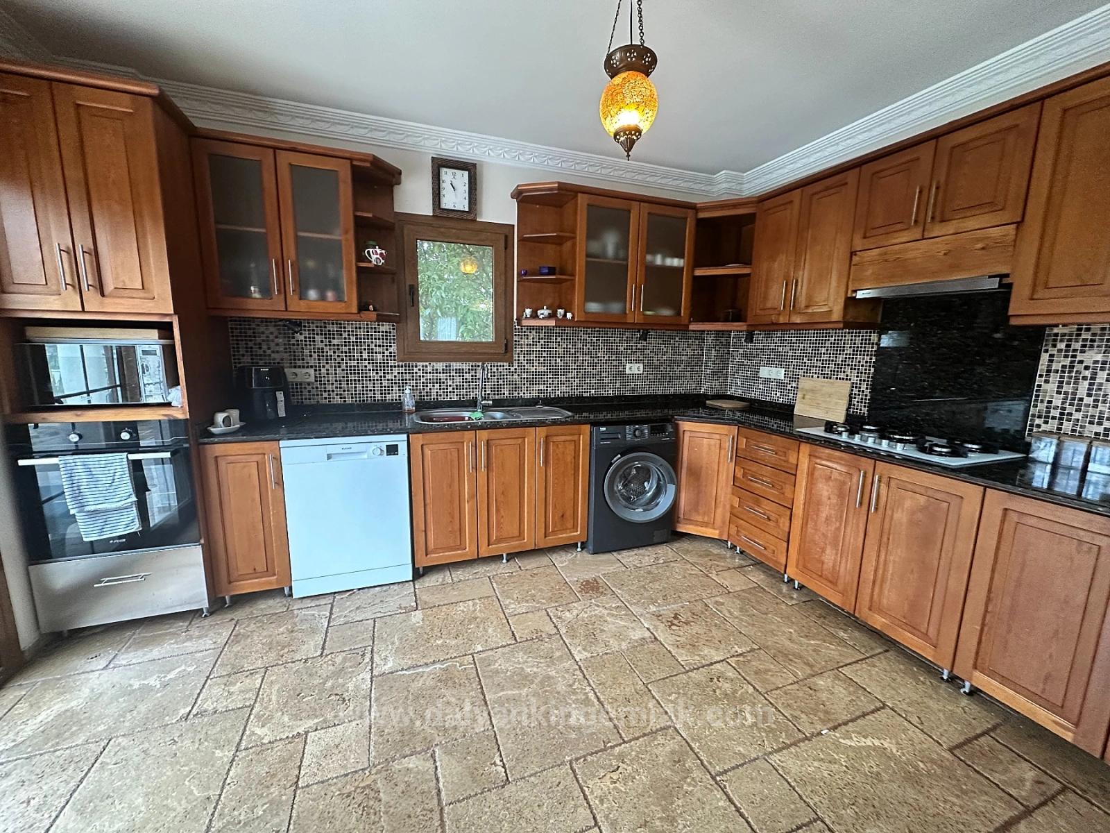 Located just steps from the vibrant center of Dalyan, yet situated on a remarkably quiet, green back street, Villa Gold stands out with its rare balance of accessibility and tranquility. Reflecting the classic charm of Mediterranean architecture from the moment it appears, with its natural stone-clad facade and mature landscaping, the villa creates a private living space offering a sense of privacy and serenity — a sanctuary away from the city, despite being a short walk from cafes, shops, and the riverbank. Set within a meticulously landscaped 500 m² garden, the property is surrounded by lush vegetation and sunny outdoor living spaces. At its center is an inviting 40 m² swimming pool, enriched by a traditional stone barbecue that complements Dalyan's outdoor living culture. The spacious shaded front terrace offers the perfect setting for al fresco meals, peaceful afternoons, and long summer evenings against the backdrop of lush greenery. The moment you step inside, the warmth and quality of home are immediately apparent. The spacious solid wood kitchen, complete with gleaming black granite countertops and a convenient breakfast bar, forms the heart of the home — both aesthetic and functional. The ground floor is divided into two complementary living areas: an intimate winter seating area with a characterful open fireplace and a bright, breezy summer lounge. This floor also features a stylish guest bathroom, ample storage space, and an elegant double bedroom ideal for those who don't want to use stairs. The feeling of spaciousness continues upstairs. The hallway, cleverly designed with storage solutions, makes the house highly functional for both family life and holiday use. The impressively large master suite offers comfortable privacy with a dressing room and private shower bathroom. Two spacious double bedrooms share a stylish family bathroom with a corner Jacuzzi bathtub, adding an elegant layer of comfort to the living area. One of Villa Gold's most captivating features is its spacious first-floor balcony. From here, you can enjoy mountain views stretching over the green landscape of Dalyan; it offers a unique corner for watching the sunset, relaxing in the cool evening air, or sipping your morning coffee outdoors. Offered for sale fully furnished, Villa Gold is located in one of Dalyan's most sought-after central locations; it is a perfect option for permanent living, an exclusive holiday home, or a high-quality rental investment.