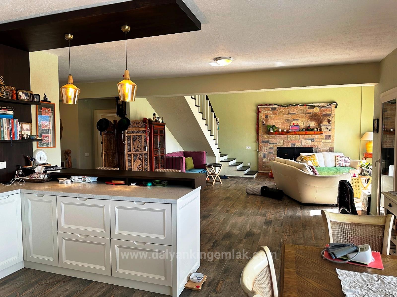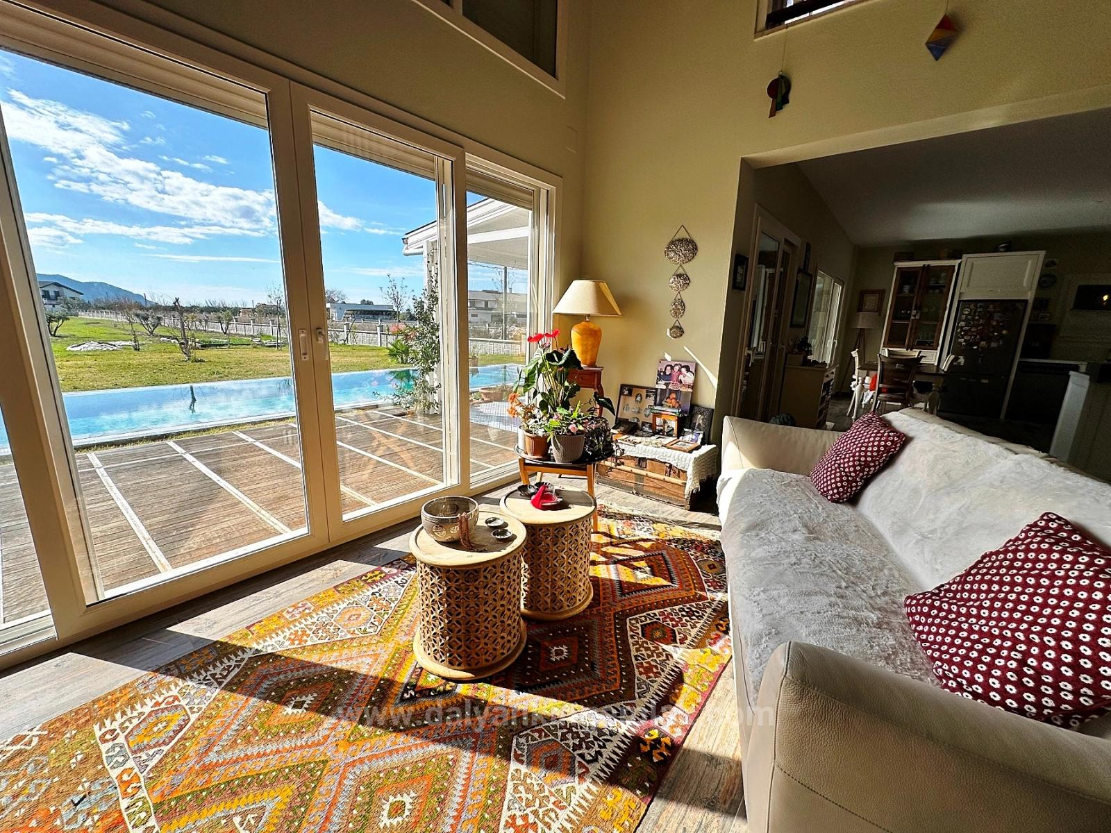 Located in the prestigious Maraş region of Dalyan, on a quiet and little-used road, this unique villa is a completely private detached living space designed according to the high standards and personal vision of its owners. Although it is only about a pleasant 15-minute walk from the city center, here you feel completely detached from daily life and the crowds, in the heart of nature, in a world of your own. The spacious grounds surrounding the villa and the impressive mountain views strongly convey this feeling from the first moment.