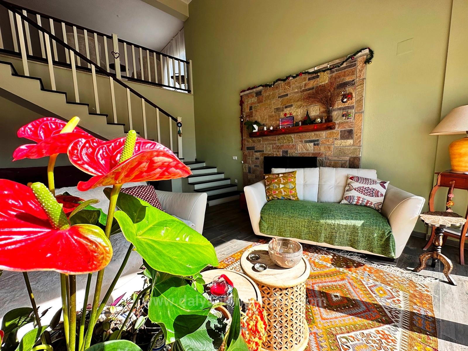 Located on a plot of land approximately 5,000 m² in size, the property's garden has been meticulously cultivated over the years, lovingly grown, and transformed into a living landscape. Stepping through the entrance gates, you are greeted by a covered parking area for four vehicles and a natural stone walkway leading you to the house. Every corner of the garden is filled with surprising details reflecting the creativity of its owners, who value art and originality; with every turn, you discover a different corner, a different atmosphere. Within the garden are a shower area, a vegetable garden, and an impressive 60 m² swimming pool. The spacious terrace at the rear of the house, half covered and half open to the sun, offers the perfect setting to relax throughout the day, enjoy the view, and soak up the Mediterranean sun. Upon entering the villa through the striking blue steel front door, you are enveloped in a refined and comfortable sense of elegance, shaped by the homeowners' carefully selected furniture and decorative pieces from around the world. The open-plan interior flows seamlessly from the entrance hall to the magnificent U-shaped kitchen, dining area, and breakfast bar; from there, you pass into the living room with an open fireplace. The enormous glass doors of the living room make the view outside almost a part of the house, offering a front-row view of the mountains. The ground floor also includes a guest bathroom, a double guest bedroom with a private en-suite bathroom, and a fully equipped pantry for food storage, an additional refrigerator, and a workspace. Climbing the wooden stairs leads to the first floor, which is in the form of an open gallery. The second living and television area here overlooks the mountains through a large panoramic window, creating an extremely peaceful atmosphere. The second bedroom, currently arranged as a healing and relaxation room, is a spacious double room with an en-suite bathroom. The master bedroom is truly impressive; it elevates luxury and comfort to the highest level with its generously sized living area and two separate en-suite bathrooms designed in a “men & women” concept.