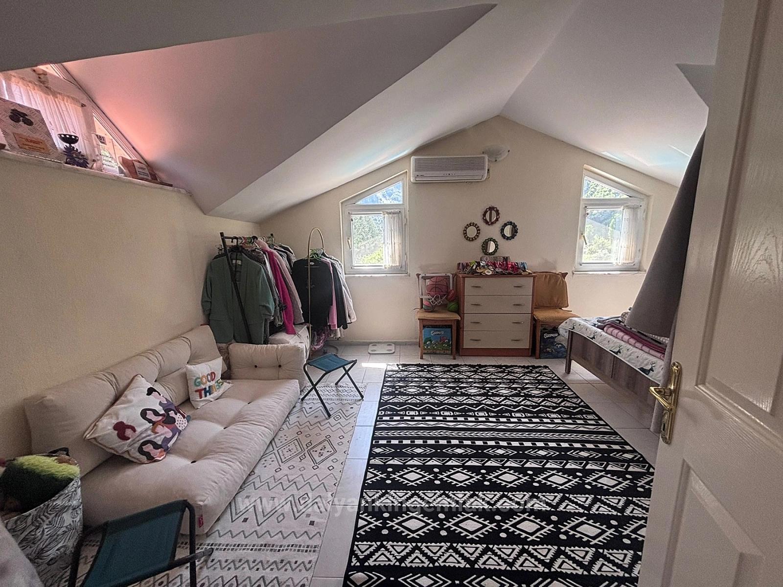 The third floor offers an open-plan kitchen and living area, a spacious bedroom, and a family bathroom with WC. The elevated balcony opening from this floor offers impressive views across the surrounding rural landscapes, allowing you to fully immerse yourself in the peaceful nature of Marmarlı.