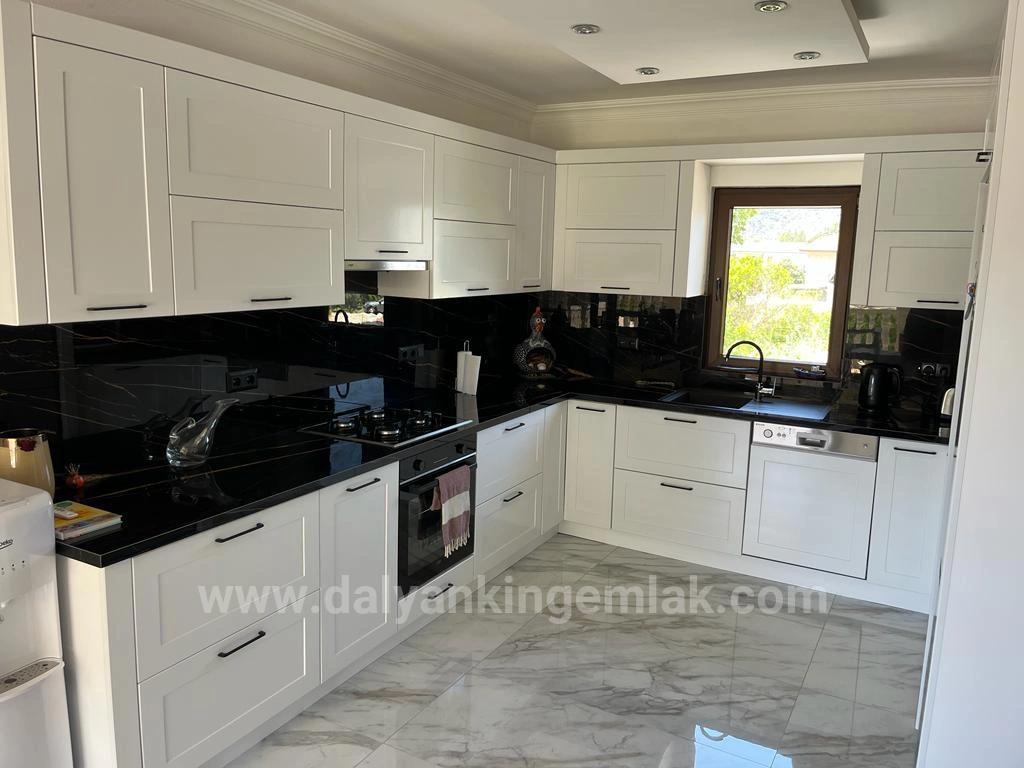 Salonun hemen yanında yer alan geniş mutfak, yakın zamanda tamamen yenilenmiş olup; zarif beyaz dolapları, siyah doğal mermer  tezgâhları ve uyumlu arka panelleriyle son derece şık ve zamansız bir tasarım sunar. Yumuşak çizgileri ve klasik duruşuyla hem estetik hem de işlevseldir. Bol dolap alanına sahip mutfak, tüm beyaz eşyalarıyla eksiksiz şekilde donatılmıştır. İç mekânda ayrılmış yemek alanı, altı kişilik ahşap masasıyla aile yemekleri ve misafir ağırlamak için ideal bir ortam yaratır. Salon bölümünde ayrıca misafirler için düşünülmüş kullanışlı bir banyo bulunmaktadır.