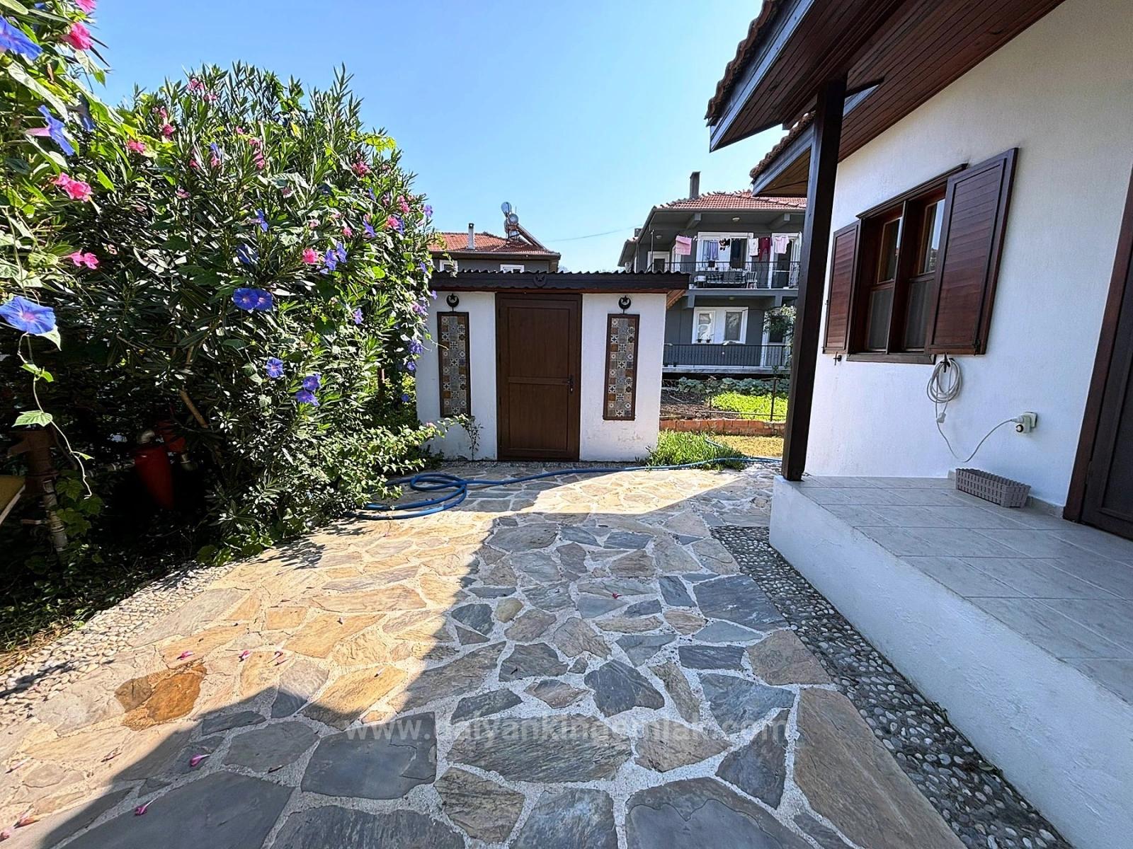 Yıllar içinde olgunlaşmış bahçesi; rengârenk çiçekler, çalılar ve yemyeşil çimlerle adeta küçük bir botanik bahçesini andırır. Bahçenin merkezinde yer alan, Roma merdivenli 40 m² büyüklüğündeki davetkâr yüzme havuzu, geniş güneşlenme terasıyla birlikte yaz günlerinin vazgeçilmez adresi olmaya adaydır. Gölgesinde oturup tarla ve dağ manzaralarını seyredebilmeniz için konumlandırılmış geleneksel ahşap köşk, bahçeye nostaljik bir zarafet katar. Pratik ihtiyaçlar düşünülerek tasarlanmış açık otopark, ayrı bir dış çamaşır odası ve bahçe ekipmanları için depo alanı da mevcuttur.