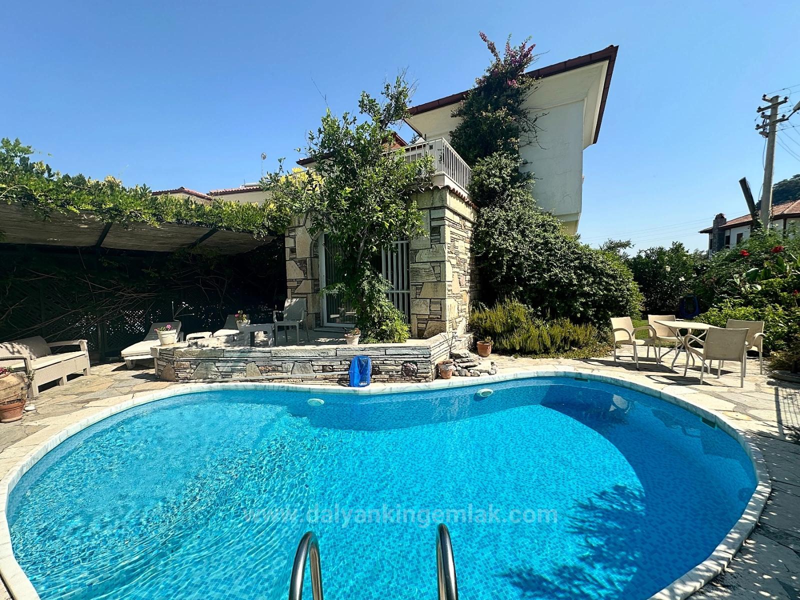 Dış mekânda, düzenli ve büyüleyici bahçe sizi karşılar; böbrek biçimli özel havuz davetkâr bir şekilde parıldar. Doğal gölgeliklerle çevrili güneşlenme alanı, güneş ve serinlik arasında ideal bir denge sunar. Yeşil bitkiler ve taş detaylar villanın dingin ve zamansız çekiciliğini tamamlar.