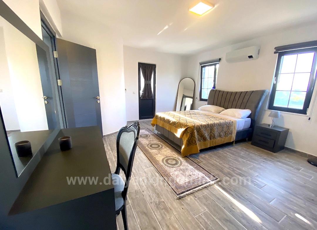 Kıvrımlı merdivenlerden çıkıldığında, salonu yukarıdan gören bir asma kat (mezzanine) sizi karşılar. Bu katta, biri şu anda üst salon olarak kullanılan olmak üzere toplam dört yatak odası ve hem duşakabin hem de küvet içeren ana banyo yer alır. Odaların tamamı geniş ölçülere sahip çift kişilik odalar olup, üçü balkona açılır. Oldukça büyük ana yatak odası ise özel banyosuyla ayrıcalıklı bir yaşam alanı sunar. Bir kat daha yukarı çıkıldığında ulaşılan çatı katı, şu anda kütüphane ve çalışma alanı olarak kullanılmakta olup, büyüklüğü sayesinde rahatlıkla altıncı bir yatak odasına dönüştürülebilir. Ana villa, konforlu bir şekilde on iki kişiyi ağırlayabilecek kapasiteye sahiptir.